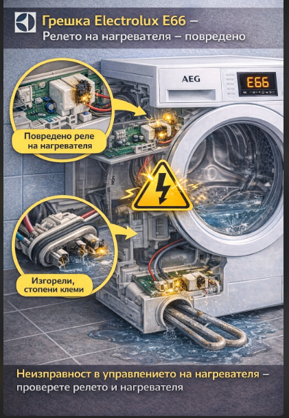 Грешка E66 се появява при пералните машини Electrolux, когато уредът засече неправилна работа на релето на нагревателя. Това е защитна функция на електрониката, която спира работа на пералнята, за да предотврати прегряване, късо съединение или други повреди на електрическата верига.
