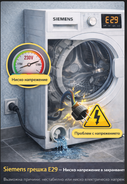 Грешка E29 – ниско напрежение в захранването при перални Siemens